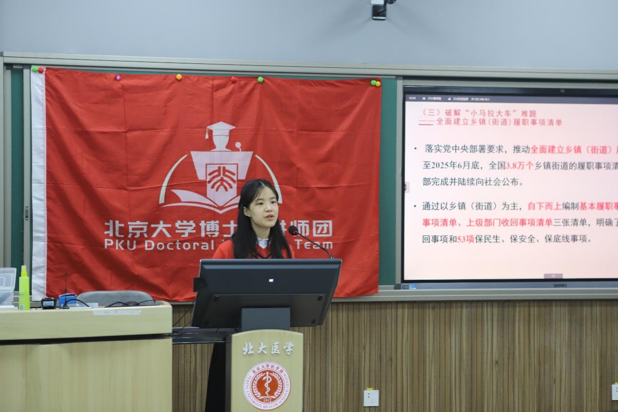 本次培训设置专题报告、学生骨干技能提升培训、团委及学院内各项制度介绍三个环节,内容兼具理论深度与实践指导性,引导各位同学深入学习贯彻习近平新时代中国特色社会主义思想。北京大学博士生讲师团讲师林洪乐以"进一步全面深化改革,把我国制度优势更好转化为国家治理效能"为题,系统解读党的二十届四中全会精神。她结结合自身实际工作经历,从全会审议通过的《中共中央关于制定国民经济和社会发展第十五个五年规划的建议》出发,深入浅出地阐释了"“十五五”"时期我国经济社会发展的目标任务与战略部署,回顾了我国行政机构调整在对台、港澳、科学技术等方面的成功经验,重点解读了"把制度优势更好转化为国家治理效能"的核心要义。她强调学生骨干要深刻认识全会的历史意义与现实意义,立足“四个面向”的战略导向,将个人成长融入中国式现代化建设中。