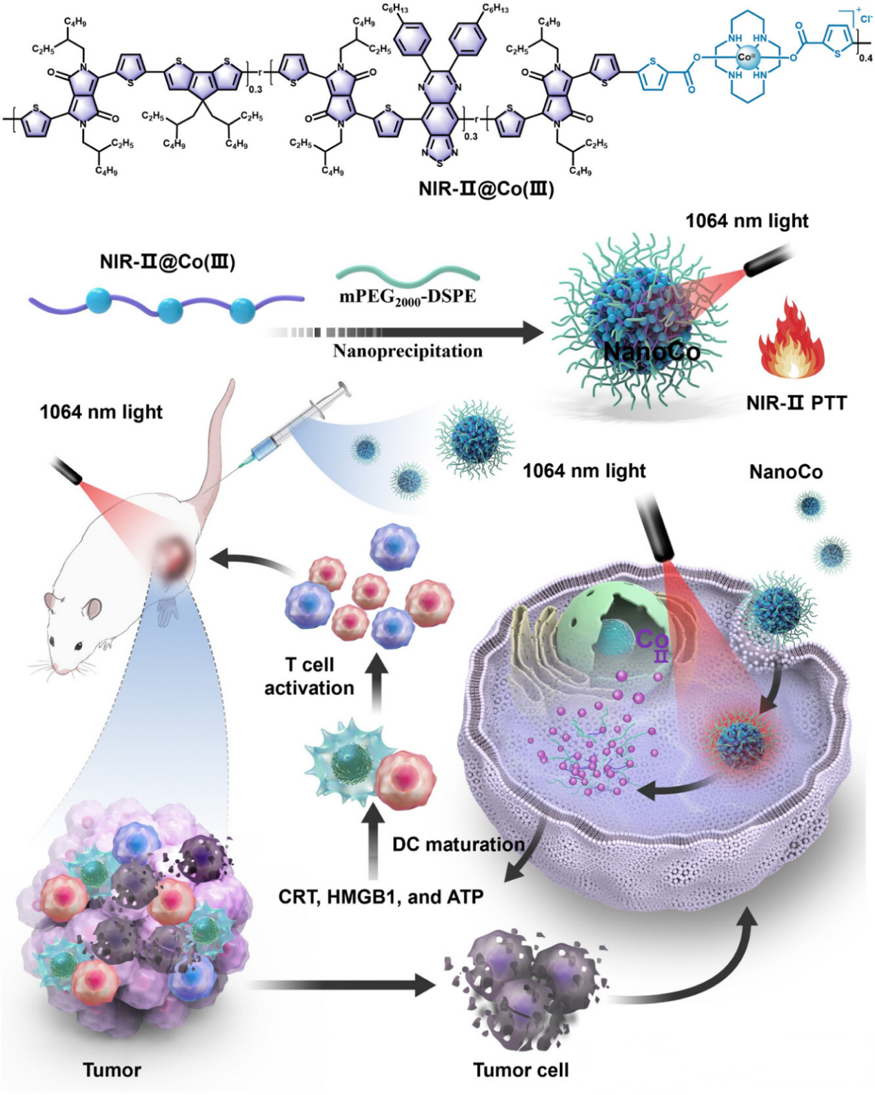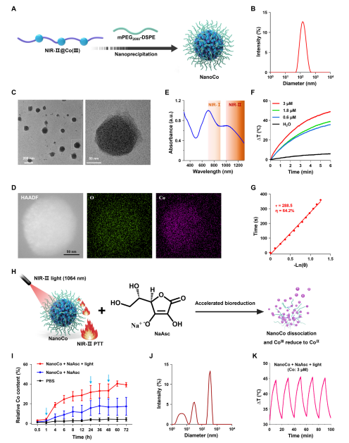 钴基配合物作为癌症治疗中具有前景的金属药物,其传统钴(II)制剂因缺乏选择性常导致系统性毒性。为提高治疗的靶向性,研究者提出利用无毒的钴(III)前药,在肿瘤细胞外间隙微环境中,通过特异还原细胞毒性钴(II)来实现肿瘤精准杀伤。具体是开发了近红外二区(NIR-II,1000–1700 nm)光控的Co(III)纳米药物(NanoCo)。NanoCo在1064 nm激光照射下表现出高达64.2%的光热转换效率,远超多数已知光热材料。光照不仅有效产热,还可加速Co(III)向Co(II)的还原,从而在时间和空间上精确控制细胞毒性金属物种的释放。该过程同步诱导免疫原性细胞死亡(ICD),促进树突状细胞成熟与抗肿瘤免疫应答,实现了光热治疗、化学治疗与免疫治疗的多模式协同。相关成果以题为“NIR‑II Photoactivatable Cobalt(III) Nanoparticles for Photoactivated Metal Chemo‑Immunotherapy”发表于《Advanced Materials》。
