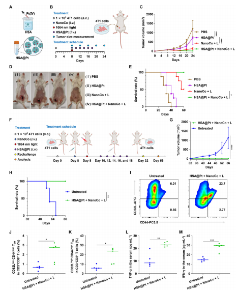 图5. HSA@Pt + NanoCo + L 在4T1 肿瘤携带小鼠模型中消除肿瘤并诱导长期免疫记忆效应