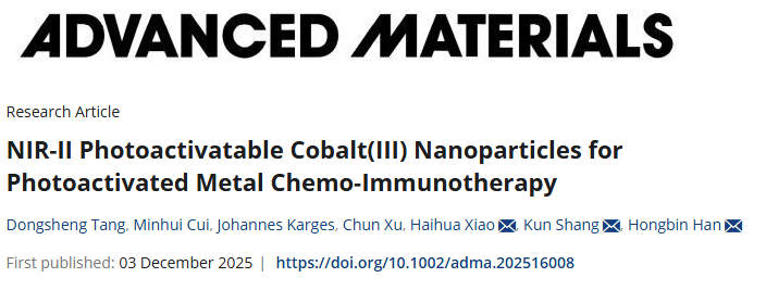 D. Tang, M. Cui, J. Karges, et. al., NIR-II Photoactivatable Cobalt(III) Nanoparticles for Photoactivated Metal Chemo-Immunotherapy, Adv. Mater., 2025, e16008. https://doi.org/10.1002/adma.202516008